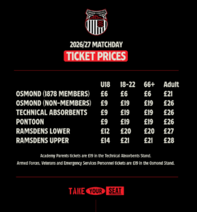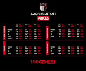 We can also confirm that 1878 Memberships will go on sale at the beginning of July for the 2026/27 season. Adult memberships will increase from £15 to £20, while U18 memberships will rise from £5 to £10.